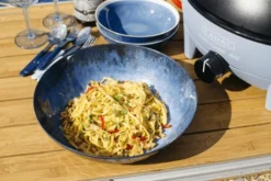 This is a robust compact and portable BBQ for use as a tabletop unit. It has a non-stick ceramic coated cooking grill, made from aluminium so there is perfect heat distribution. The fat pan fits inside an outer pan and is easily removed to wash and clean. A pot stand is included so pots, Cadac paella pan or pizza stone can be used.