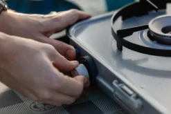 The Camping Kitchen® 2 CV Piezo is the perfect companion stove for any family trip, either for a quick weekend away or for a longer stay. It is a light and easily portable two burner stove. The slim design, with built-in carry grip, ensures space-saving when packing your car or caravan.
