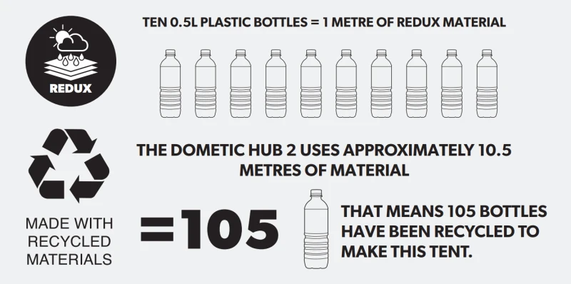 Dometic’s Redux fabric is made completely from Recycled Plastic Bottles, making it one of the most Eco-friendly materials on the market. What was once waste is now re-used to allow us to enjoy nature rather than destroy it. The high-grade polyester material is durable and very waterproof, it has a rip-stop thread running throughout the material to offer reinforcement should it get accidently caught on something.