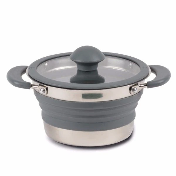 The Kampa collapsible saucepan is available in a choice of three sizes. All the pans collapse and fold down making them ideal to pack for use on your camping trip.ย