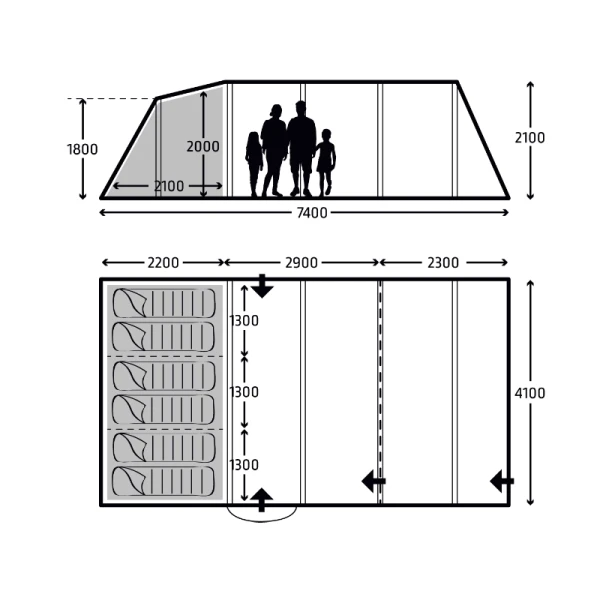 At the rear you’ll find the large bedrooms, in a 2+2+2 configuration and in front of these is a large living area with a fully sewn-in groundsheet keeping the weather and bugs at bay. The front of the tent offers a truly flexible space, it can be incorporated into the main living area to give an exceptionally large interior area or it can be divided off to create another room. Rolling back the front panel makes a large sun canopy. It is also a great area for kicking off your shoes before entering the main living area.