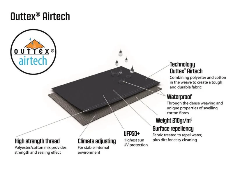- Flysheet: Outtexยฎ Airtech, 65% polyester / 35% cotton