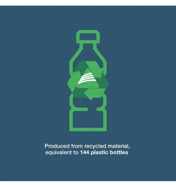 - Produced from recycled material equivalent to 144 plastic bottles