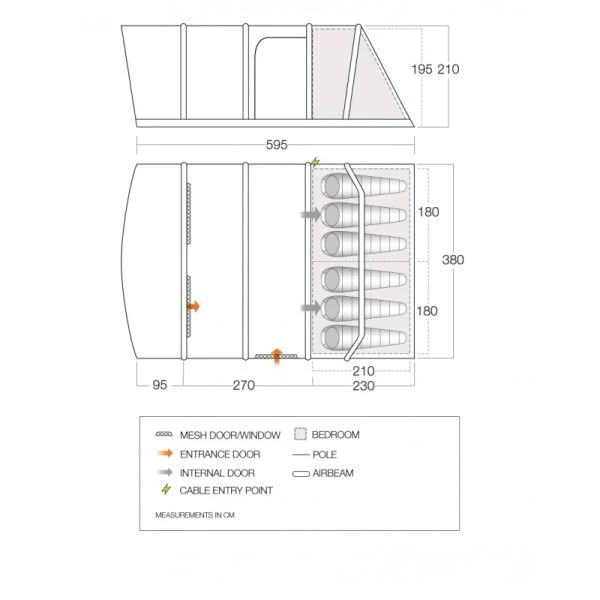 The Aether Air has a varied number of features such as a Pre attached Open Extension to give the user shelter from the wind, not to mention Dark โNightfall Bedroomsโ to stop you waking up when the sun does, two mesh doors leading out of the living area which helps to keep insects out. Vangoโs Villa Construction beams not only make it easy to inflate but roomy as the upright side wall increase height and allows furniture to be moved closer to the edge of the tent. Crystal Clear windows allow plenty of light into the tent while toggle up curtains give privacy as and when needed.