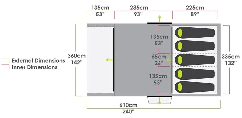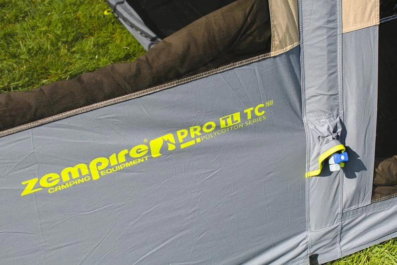 Zempire Aero Pro TL TC has undergone a massive re-design for the new season. Theyโve added some standalone features but tweaked the size of the tent to make it more spacious and practical. The design of the Aero TC is still strong and, by extending and raising the height of canopy section, it has now become a much more usable space. This combined with a new open front really helps to bring the outside in. If you are still looking for that enclosed space, then you can add on the new Pro Awning Wall Set which simply zips on to the tent and includes not only a waterproof door with tinted windows, but also a complete mesh wall as well. This wall set can still be gull-winged out like a canopy to provide additional protection against the elements.