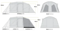 - Awning Features – 3 Stage Door, Awning Poles Included, All-Weather Access, Extended Awning Area, Roll Up Awning Door, Removable Anchor Webbing, Rain Skirt Fold Away Toggles, Rain Skirt, Gullwing Awning, Twin Access Awning Doors