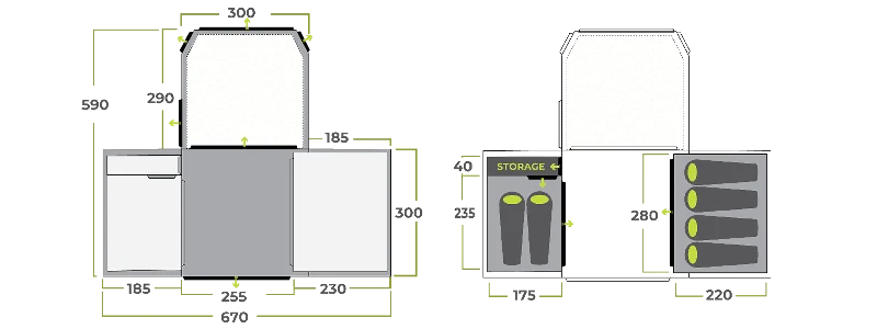 - Optional Extras – Supercell Pump, Hurricane Pump, Ground Sheet Protector, Roof Cover, Carpet
